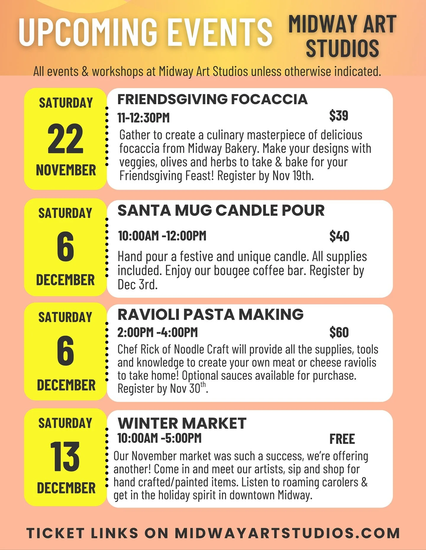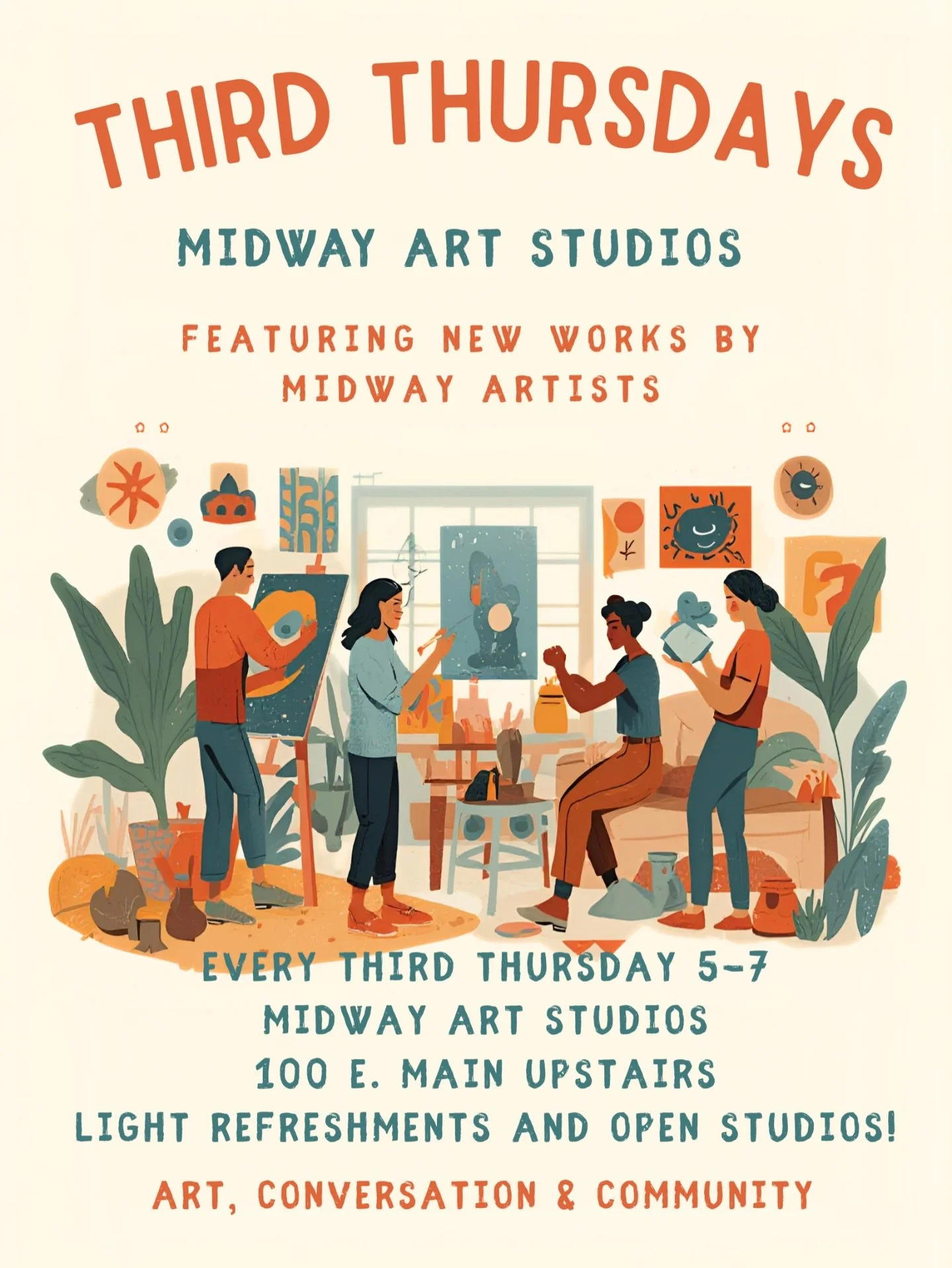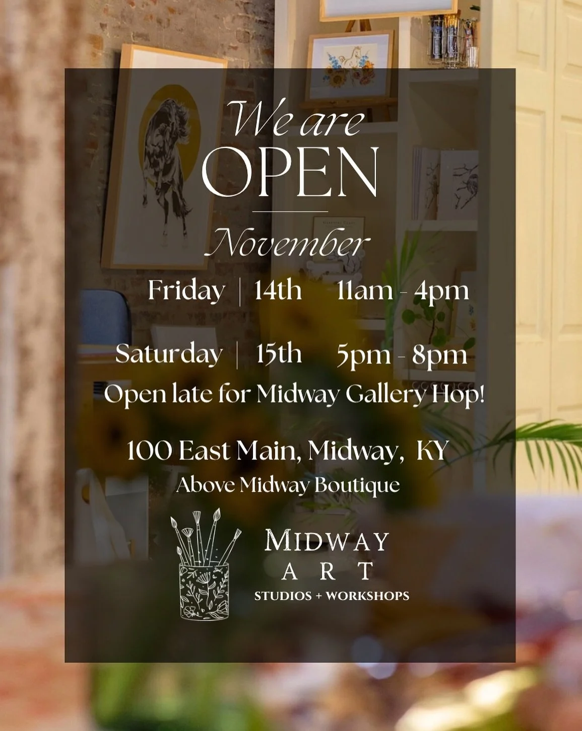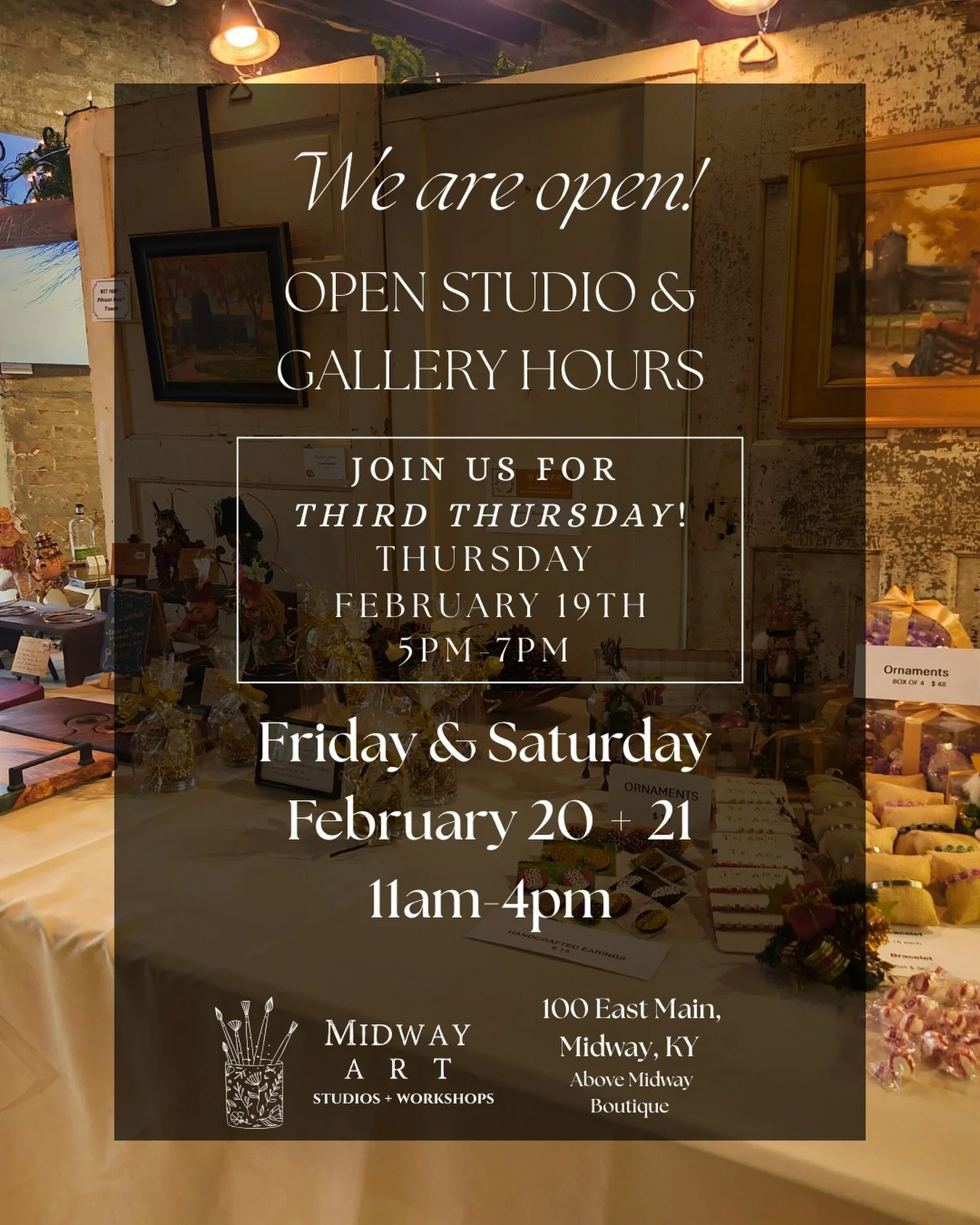 Get in Touch! Visit Us100 E Main St2nd flrMidway, KY 40347HoursFriday & Saturday11am–4pmEmailMidwayArtStudios@gmail.com Follow us on social media! View fullsize View fullsize View fullsize View fullsize Follow Us Here!