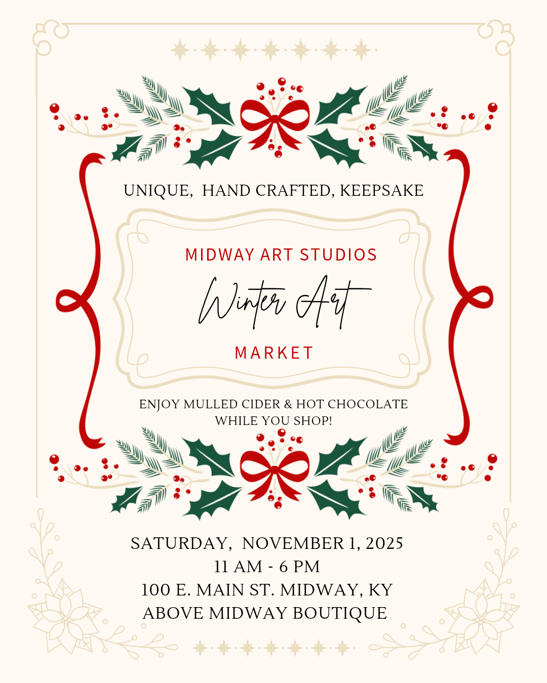 Our 9 studio artists will have OFFERINGS of HANDCRAFTED, ONE-OF-A-KIND, UNIQUE creations that can only be found at MIDWAY ART STUDIOS!